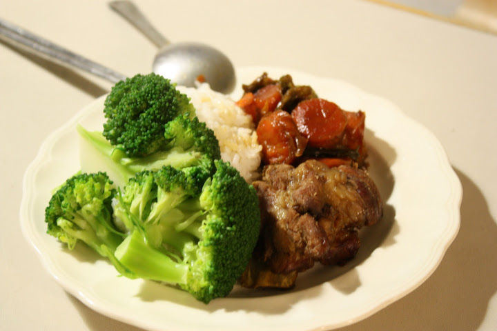 清燙花椰菜,配蔥燒排骨。蔥段跟紅蘿蔔都很軟爛,排骨雖是帶軟骨的小排,但這豬臭味還是有點去不掉,即使加了好幾片薑,也不行。看來下次要狠下心,把伏特加與薑一併加入。