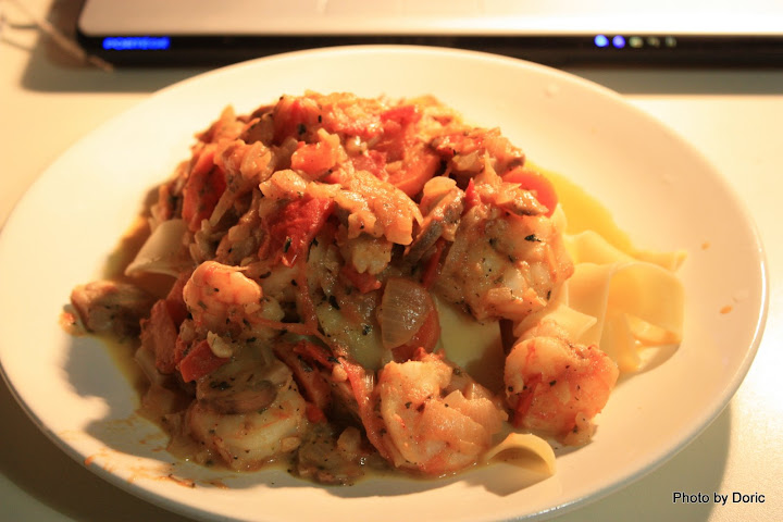 既然放了番茄,老樣子還是要加點黑胡椒、Basilikum提味,最後起鍋前又加了市場買的義式香料粉;之前作義大利麵的經驗是,香料不能熱太久,不然味道會減弱,所以起鍋前拌入香料就可以了,以免香氣逸失。宜豪本來的食譜是沒有番茄,然後有加醃過的豬肉條,我沒買豬肉,但買了蝦仁,想想番茄蝦仁義大利麵也是有看過的,所以就加蝦仁了,味道也是很合,尤其蝦仁的海鮮味讓我食指大動呀!